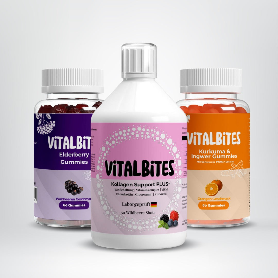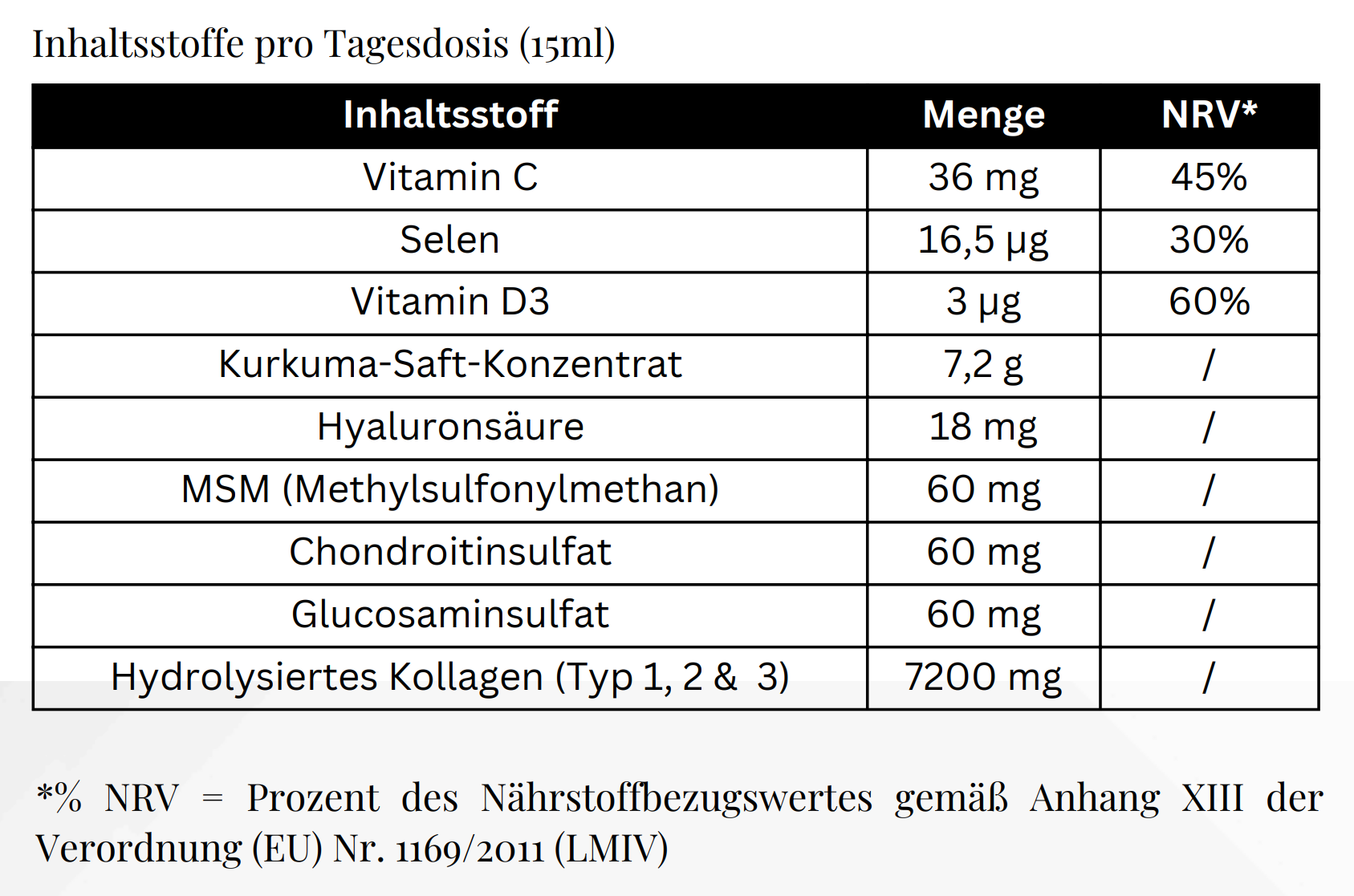 Zutaten: Kurkumasaft aus Konzentrat, hydrolysiertes Kollagen Typ 1, 2 & 3 (enthält die Aminosäuren: L-Glycin, L-Prolin, L-Alanin, L-Hydroxyprolin, L- Glutaminsäure, L-Arginin, L-Asparaginsäure, L-Serin, L-Lysin, L-Leucin, L-Valin, L-Threonin, L-Phenylalanin, L-Isoleucin, L-Hydroxylysin, L- Methionin, L-Histidin, L-Tyrosin, L-Cystein), Säureregulator (Citronensäure), Vitamin C, MSM (Methylsulfonylmethan), Glucosaminsulfat, Chondroitinsulfat, Hyaluronsäure, Aroma (natürliches Aroma), Konservierungsstoffe (Kaliumsorbat, Natriumbenzoat), Farbstoff (Süßkartoffelpulver), Süßungsmittel (Sucralose, Acesulfam-K), Selen, Vitamin D. 100 % natürliches Aroma & Farbe.